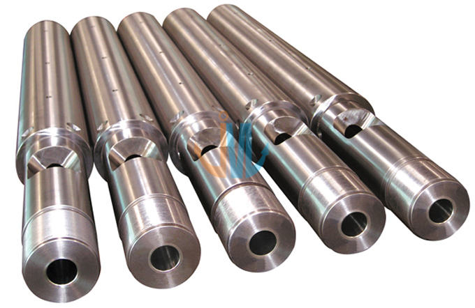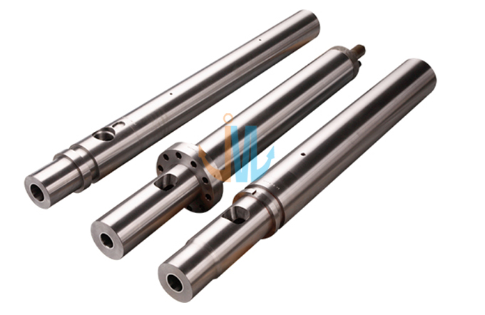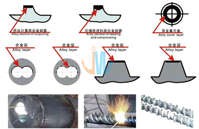 Bimetallic conical twin screw and barrel Bimetallic conical twin barrel has got the nation patent,and we are the only company in manufacturing the bimetallic conical twin barrel.Adopting the technique of rotary casting alloy,it makes the alloy powder’s compactness and wearing resistance the same as the bimetallic single barrel thus solving the defect of short service life and low wear-resisting of nitrided conical twin barrel,and rewrite the history of only manufacturing bimetallic single barrel but no bimetallic conical twin double barrel in domestic land. Wc-10 tungsten carbide alloy ,with the characteristics of high hardness ,high hard-wearing and corrosion resistance ,and high temperature resistance ,the hardness of alloy layer reaches HRC60-65,thus having the service life of 5-8times longer than the nitrided one.It is suitable for processing PVC plus calcium powder,building plastic template, pipe, sheet, ,WPC , hanging plate and other engineering plastics. Grade A screw: the base material is SKD61,Din 1.8519 or 1.8550,with the hardening then nitriding, the surface hardness of screw can reach HRC60-65,thus having the characteristics of high wearing and corrosion resistance . Grade B screw : the base material is 38CrMoAla,the screw flight through the high temperature spraying Ni-based alloy powder,the surface hardness can reach HRC58-62,thus having the characteristics of high wearing and corrosion resistance.