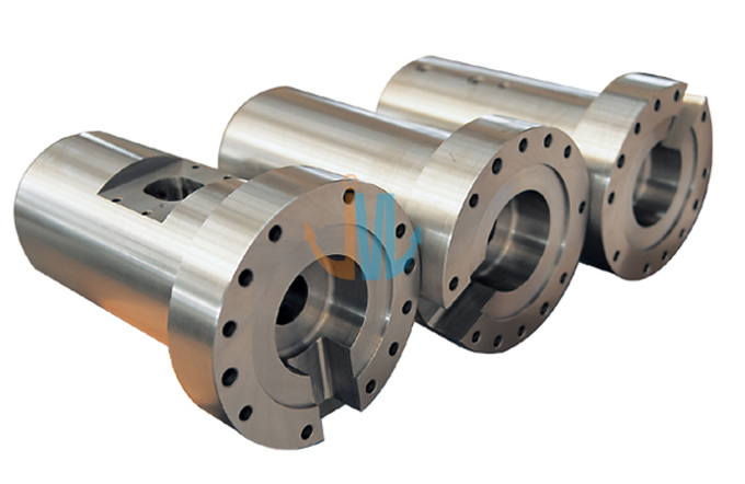 Bimetallic screw and barrel for rubber machine The bimetallic barrel for rubber machine is produced through high-temperature and speed centrifugal casting,the thickness of the alloy layer could reach 2mm-3mm one side,thus having the characteristics of high hardness , high wearing and high corrosion resistance . The screw flight spray the WC-10 tungsten carbide alloy powder,the thickness of alloy layer is 1.5mm-3.5mm, the hardness can reach HRC58-62.It is suitable for the rubber machine of the pinned cold feeding,ordinary cold feeding,exhaust cold feeding,new kind of hot feeding,rubber filtering,rubber injection ,magnetic strip.